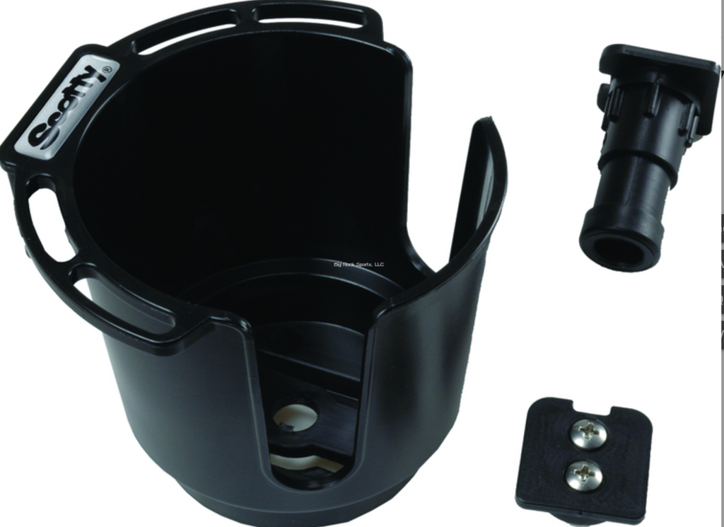 Cup Holder with Button Mount and Rod Holder Post Mount. For cans, coffee mugs and insulated sleeves easily mount the Cup Holder to any Scotty Rod Holder Mounts on your boat or kayak. Use the Bulkhead / Gunnel Mount to attach the Cup Holder horizontally or vertically. Convenient accessory rack to hang lures and tools.